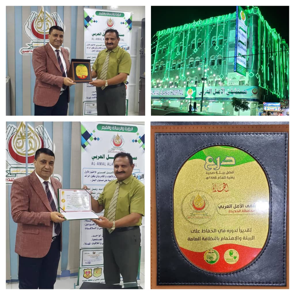 احتفلت إدارة مستشفى الأمل العربي بمدينة الحديدة اليوم بتتويج المستشفى بلقب افضل بيئة يمنية نظيفة للعام الثالث على التوالي والذي حصلت عليه في اليوم العالمي للبيئة الذي احتفلت به اليمن في الخامس من يونيو الماضي ٢٠٢٥م تقديرا لاهتمام المستشفى واسهامها في تعزيز جهود حماية البيئة والحفاظ على النظافة العامة..