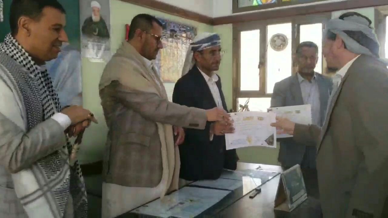 كرم وكيل أول محافظة عمران عبدالعزيز ابو خرفشة ومدير مكتب التربية والتعليم بالمحافظة زيد رطاس ومدير عام مديرية عمران عبدالرحمن العماد معلمين ووكلاء مجمع شهداء التربية