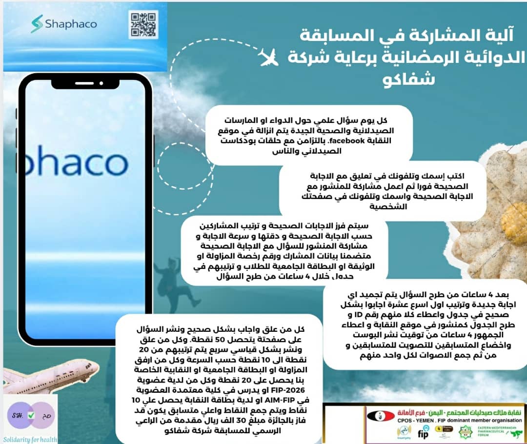 مسابقة دوائية في رمضان الكريم ترافق برنامج بودكاست الصيدلاني والناس برعاية شركة شفاكو ٳعلاميا من منطلق الشراكة المهنية والمسؤولية الاجتماعية وبشروط الالتزام بمواثيق واتفاقيات الترويج الدوائي الاخلاقي وفق الضوابط العالمية لذلك فالشريك الاعلامي لا يسيطر اطلاقا علۑ المحتوۑ العلمي او الاجراءت المتعلقة بالنشاط وهذا توجه رائع من الراعي الاعلامي لنقل التكنولوجيا الترويجية الحديثة Promotional Technology Transfer القائمة علۑ الشراكة المهنية في خدمة المجتمع & code of conducts in drug promtion .