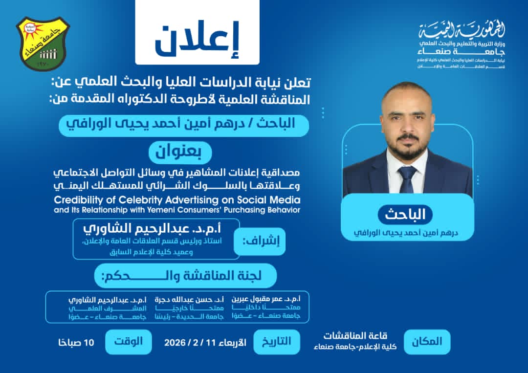 وتأتي هذه المناقشة في إطار حرص كلية الإعلام بجامعة صنعاء على دعم البحث العلمي الرصين، وتشجيع الدراسات الأكاديمية التي تتناول القضايا الإعلامية المعاصرة، وتسهم في فهم تأثيرات الإعلام الرقمي والإعلاني على المجتمع وسلوكياته الاستهلاكية.