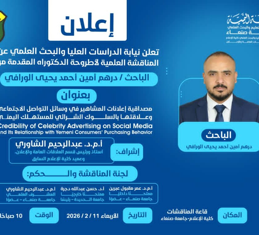 وأشادت اللجنة بما تضمنتة الأطروحة من معالجة علمية ومنهجية لموضوع مصداقية إعلانات المشاهير في وسائل التواصل الإجتماعي وعلاقتها بالسلوك الشرائي للمستهلك اليمني وما تمثلة من إضافة نوعية في مجال الإعلام الرقمي ..
