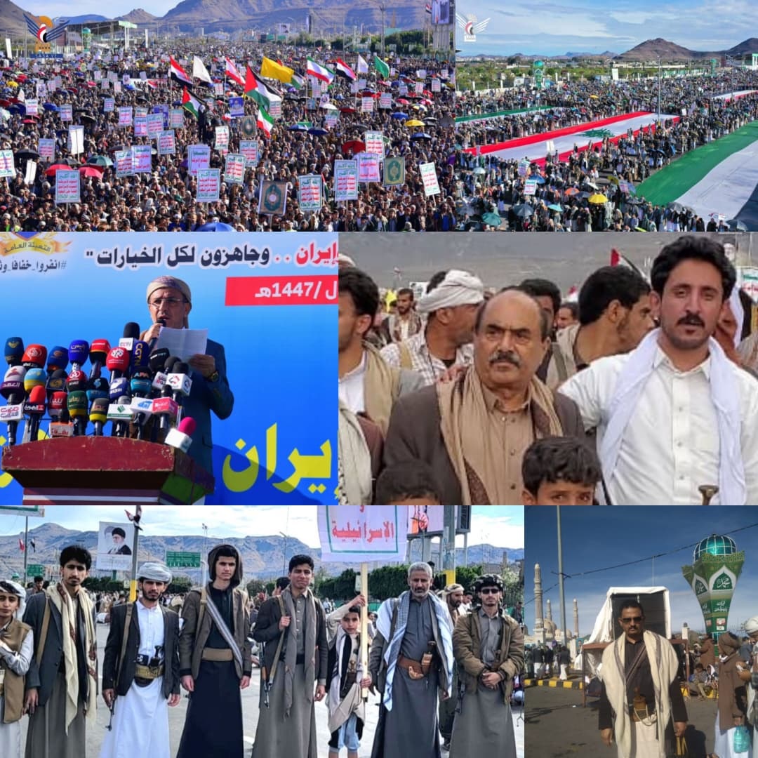 وجددت الحشود التي رفعت أعلام اليمن وفلسطين ولبنان وإيران، التأكيد على موقف اليمن الثابت والمبدئي في نصرة الشعب الفلسطيني وقضيته العالة، والتصدي للغطرسة الأمريكية والصهيونية التي تستهدف الأمة العربية والإسلامية.