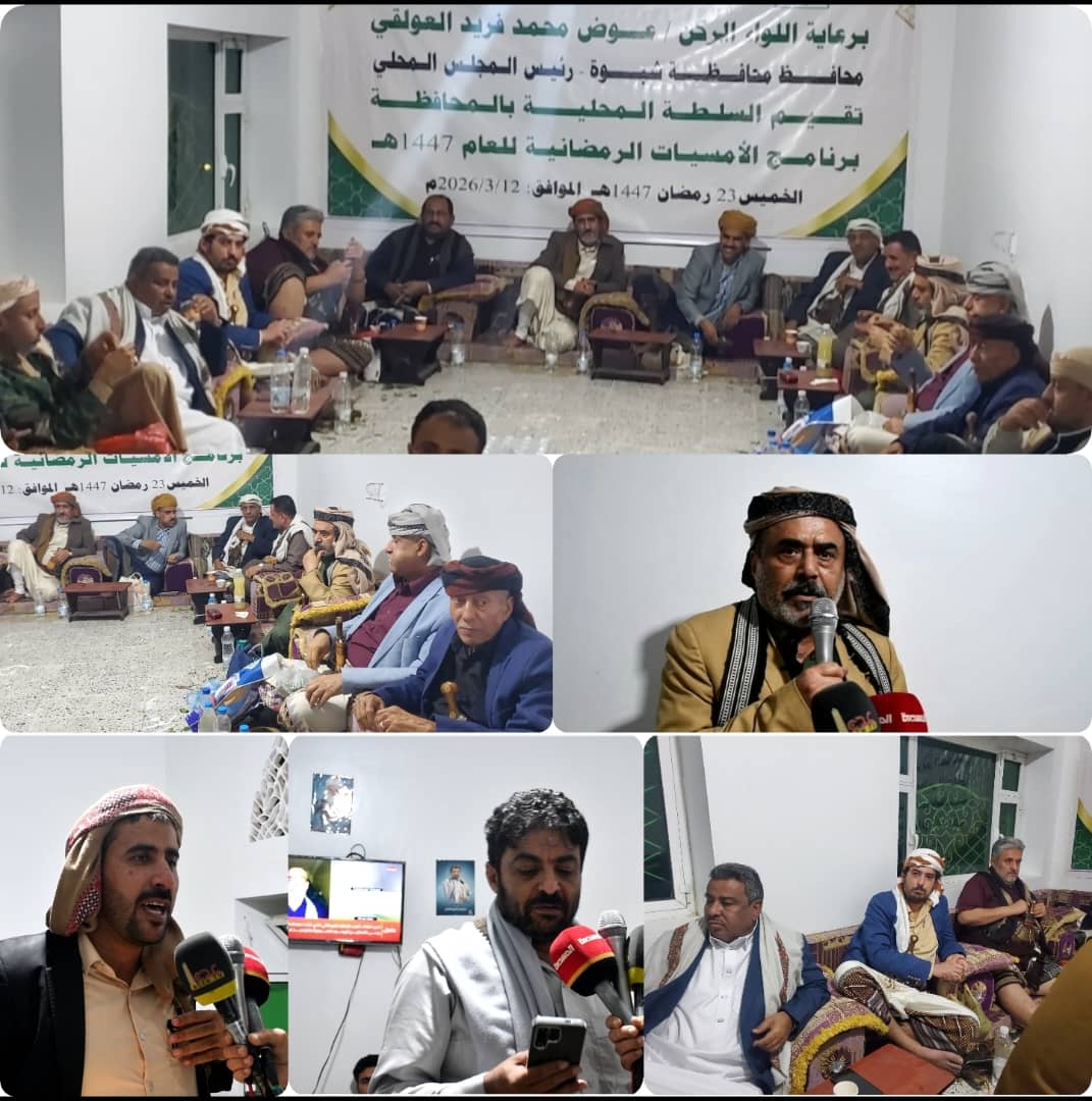 صنعاء _ خاص أحيت السلطة المحلية والمكتب التنفيذي بمحافظة شبوة أمسٍ برنامج الأمسيات الرمضانية للعام 1447هـ بأمسية رمضانية إحياءً لذكرى استشهاد أمير المؤمنين الإمام علي بن أبي طالب عليه السلام وذكرى يوم القدس العالمي. وخلال الأمسية التي حضرها الشيخ ناصر بن ناصر المحضار نائب وزير الإدارة والتنمية المحلية والريفية، ومحافظو المحافظات الجنوبية والشرقية: اللواء لقمان باراس محافظ حضرموت،…