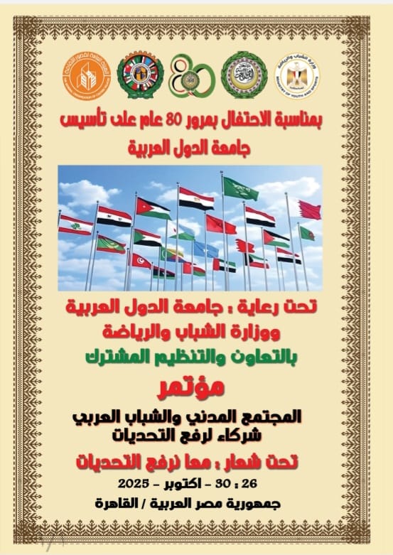 تحت رعاية جامعة الدول العربية ووزارة الشباب والرياضة المصرية، تنطلق غدًا فعاليات مؤتمر “المجتمع المدني والشباب العربي شركاء لرفع التحديات” الذي ينظمة مجلس الشباب العربي للتنمية المتكاملة في إطار الاحتفال بمرور ثمانين عامًا على تأسيس جامعة الدول العربية، خلال الفترة من 26 إلى 30 أكتوبر 2025، في جمهورية مصر العربية – القاهرة بالتعاون والتنظيم المشترك مع الأمانة العامة لجامعة الدول…