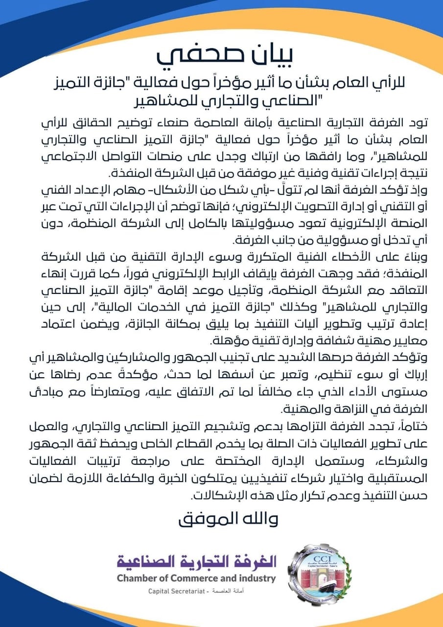 تود الغرفة التجارية الصناعية بأمانة العاصمة صنعاء توضيح الحقائق للرأي العام بشأن ما أثير مؤخراً حول فعالية “جائزة التميز الصناعي والتجاري للمشاهير”، وما رافقها من ارتباك وجدل على منصات التواصل الاجتماعي نتيجة إجراءات تقنية وفنية غير موفقة من قبل الشركة المنفذة. وإذ تؤكد الغرفة أنها لم تتولَّ – بأي شكل من الأشكال- مهام الإعداد الفني أو التقني أو إدارة التصويت…