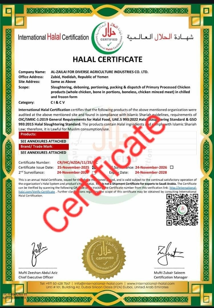 دعاء القادري – صنعاء في إنجاز وطني غير مسبوق في قطاع الصناعات الغذائية، حصلت شركة الزيلعي للصناعات الزراعية المتنوعة المحدودة على شهادة “حلال” الدولية من جهة الاعتماد العالمية International Halal Certification، لتكون أول منشأة في اليمن بقطاع الدواجن تنال هذا الاعتماد المرموق. وجاء منح الشهادة بعد استيفاء الشركة لكافة المتطلبات الشرعية والفنية، وفقًا لأعلى المعايير والمواصفات الدولية، بما في ذلك:…