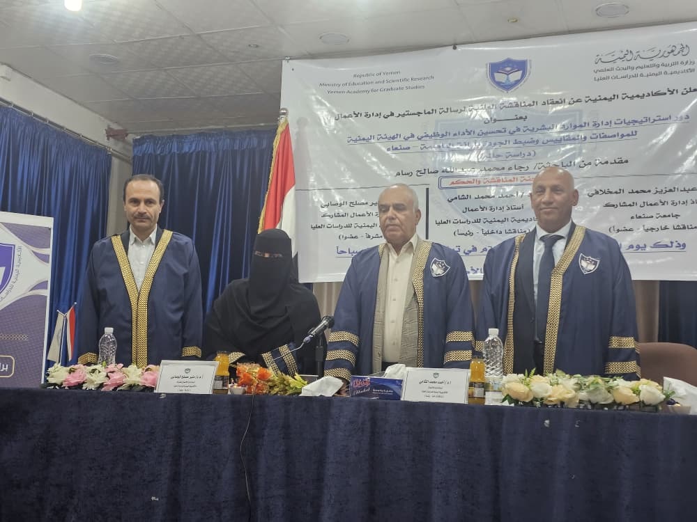 حصلت الباحثة رجاء محمد عبد الله صالح رسام على درجة الماجستير بتقدير امتياز من الأكاديمية اليمنية للدراسات العليا، عن رسالتها الموسومة بـ: “دور استراتيجيات إدارة الموارد البشرية في تحسين الأداء الوظيفي بالهيئة اليمنية للمواصفات والمقاييس وضبط الجودة بأمانة العاصمة”. وقد أشادت لجنة المناقشة والحكم بالجهود العلمية المتميزة التي بذلتها الباحثة، وما توصلت إليه الدراسة من نتائج تهدف إلى تطوير استراتيجيات…