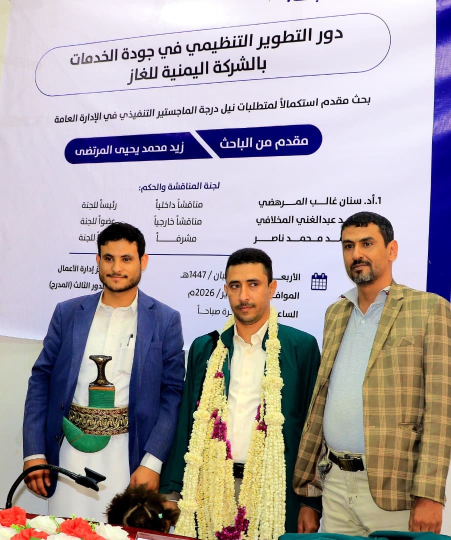 شهد كلية التجارة والاقتصاد بجامعة صنعاء، يوم أمس الأربعاء، المناقشة العلنية لرسالة الماجستير التنفيذي في الإدارة العامة المقدمة من الباحث زيد محمد يحيى المرتضى، والموسومة بـ: ”دور التطوير التنظيمي في جودة الخدمات بالشركة اليمنية للغاز” وبعد عرض مستفيض ومناقشة علمية رصينة، منحت لجنة المناقشة والحكم الباحث درجة الماجستير بتقدير امتياز بنسبة بلغت 95%، مشيدةً بالجهد المبذول في الرسالة وما قدمته…